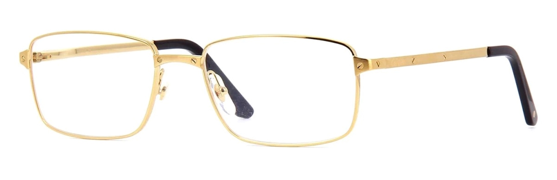 Mẫu mới nhưng vẫn trung thành với thiết kế truyền thống với hàng logo Cartier hình đinh vít kể cả ở vị trí nổi bật nhất là trước cầu kính. Thiết kế hình chữ nhật basic với size trung bình 56mm rất dễ phù hợp với quý Ông ưa sự đơn giản, không quá khoa trương nổi bật. Toàn bộ khung gọng cận được bọc vàng 18K giữ nguyên ánh sáng và độ bóng sang trọng của kim loại quý đồ trang sức.
