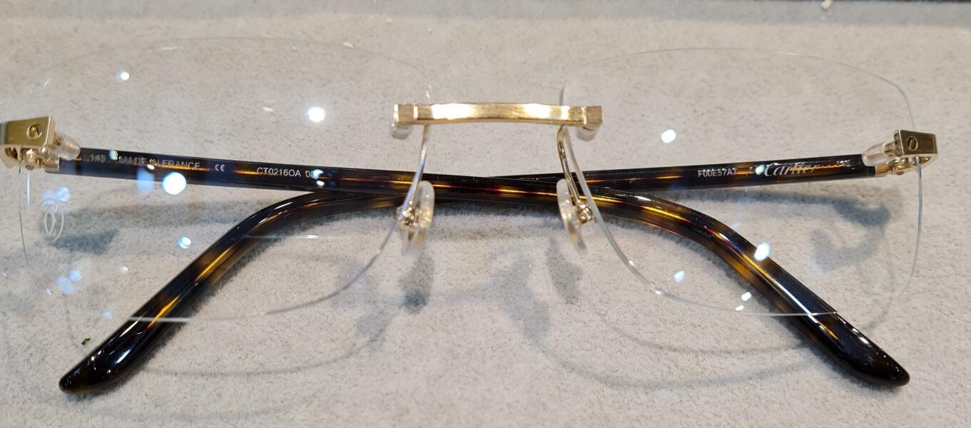 Mẫu gọng cận Cartier cao cấp hoàn toàn mới khi kết hợp càng kính nhựa đồi mồi với khung gọng bọc vàng 18K mang hơi hướng hoài cổ của những kiểu dáng gọng kính đầu thế kỷ 20.