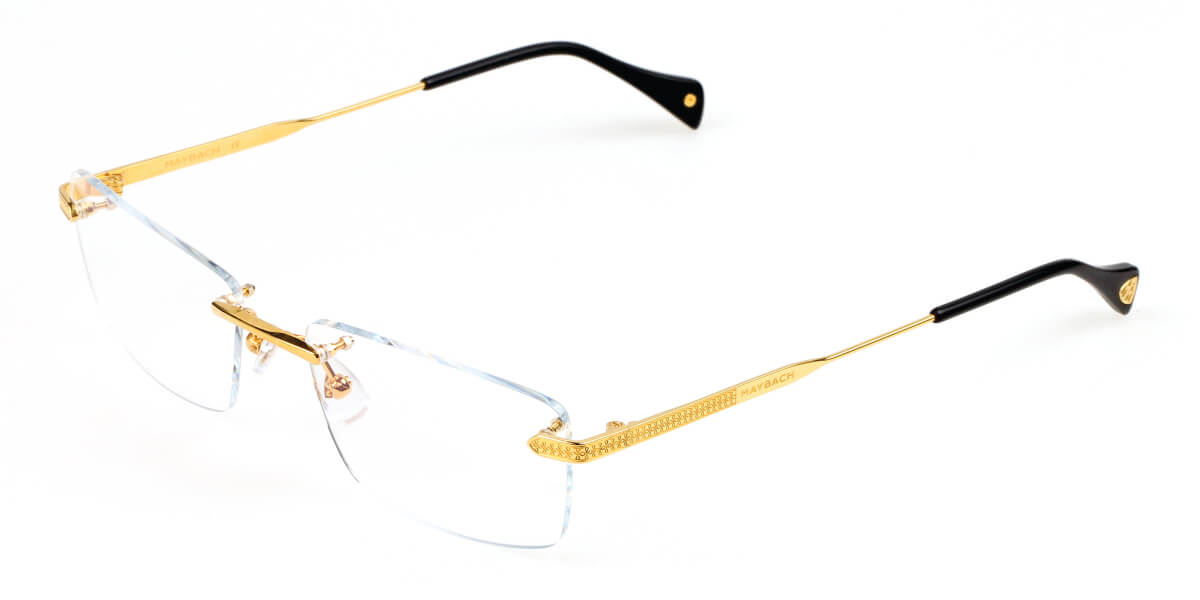 Mẫu gọng khoan không viền cao cấp với chất liệu titan siêu bền siêu nhẹ, được mạ vàng 24K. Tổng thể kính dáng vuông vắn, khung gọng mỏng nhẹ nhàng được chế tác tỉ mỉ với hàng trám nổi nơi đầu càng kính. Chuôi càng làm bằng chất liệu acetate cao cấp đen bóng nổi bật với logo 2 chữ M của Maybach