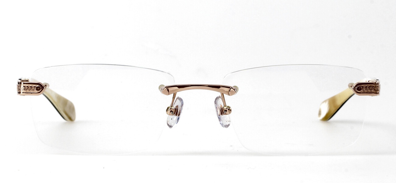 Mẫu gọng cận siêu sang cao cấp với thiết kế khoan ốc không viền, chất liệu full titan kể cả ve mũi cũng làm bằng chất liệu titan siêu bền mà không gây kích ứng da, mạ vàng 24K. Tổng thể gọng kính vuông vắn với bản to chắc chắn, càng kính được chế tác bản cỡ trung xuyên suốt từ đầu càng đến chuôi Điểm nhấn là phần trạm khắc dải kim cương nơi đầu càng