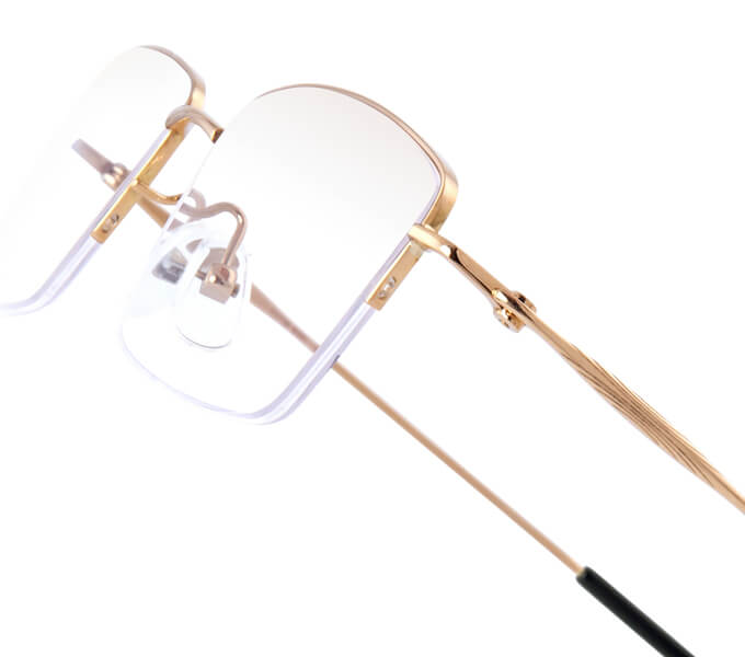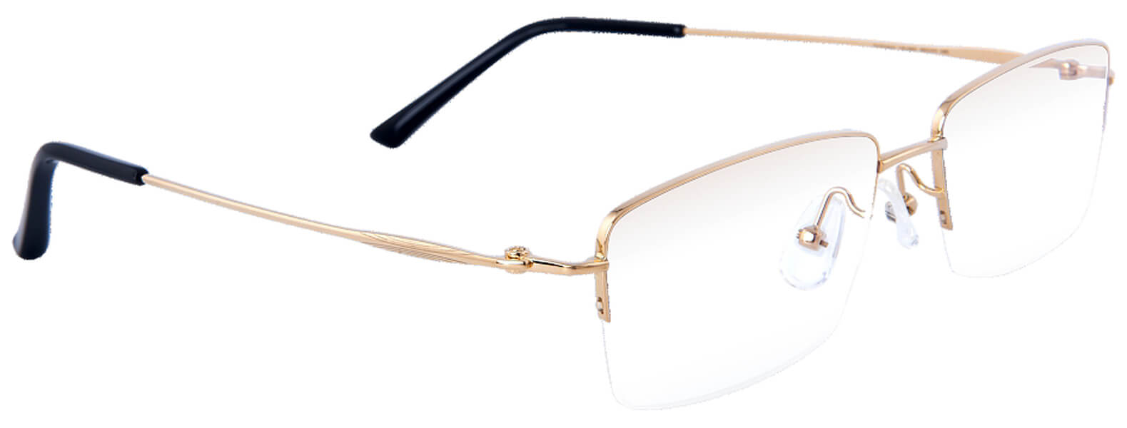 Gọng cận viễn nam bằng chất liệu vàng đúc với trọng lượng 14.1g thiết kế tối giản, thanh lịch với hình dáng chữ nhật mềm mại và cắt cước nửa khung trang nhã, thoáng đãng.