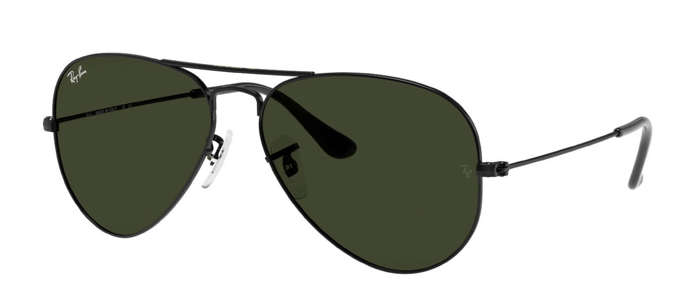 >Mẫu Rayban aviator phi công truyền thống mã màu L2823 với gọng kim loại sơn đen bóng kết hợp với tròng kính rayban màu truyền thống G15 màu xanh lá đậm.